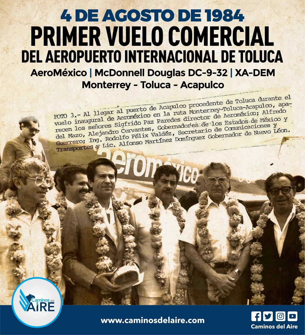 Un día como hoy 4 de Agosto pero de 1984, se realizó el vuelo inaugural del Aeropuerto Internacional de Toluca. La fotografía compartida, corresponde a la llegada del vuelo a sus destino, el Aeropuerto...