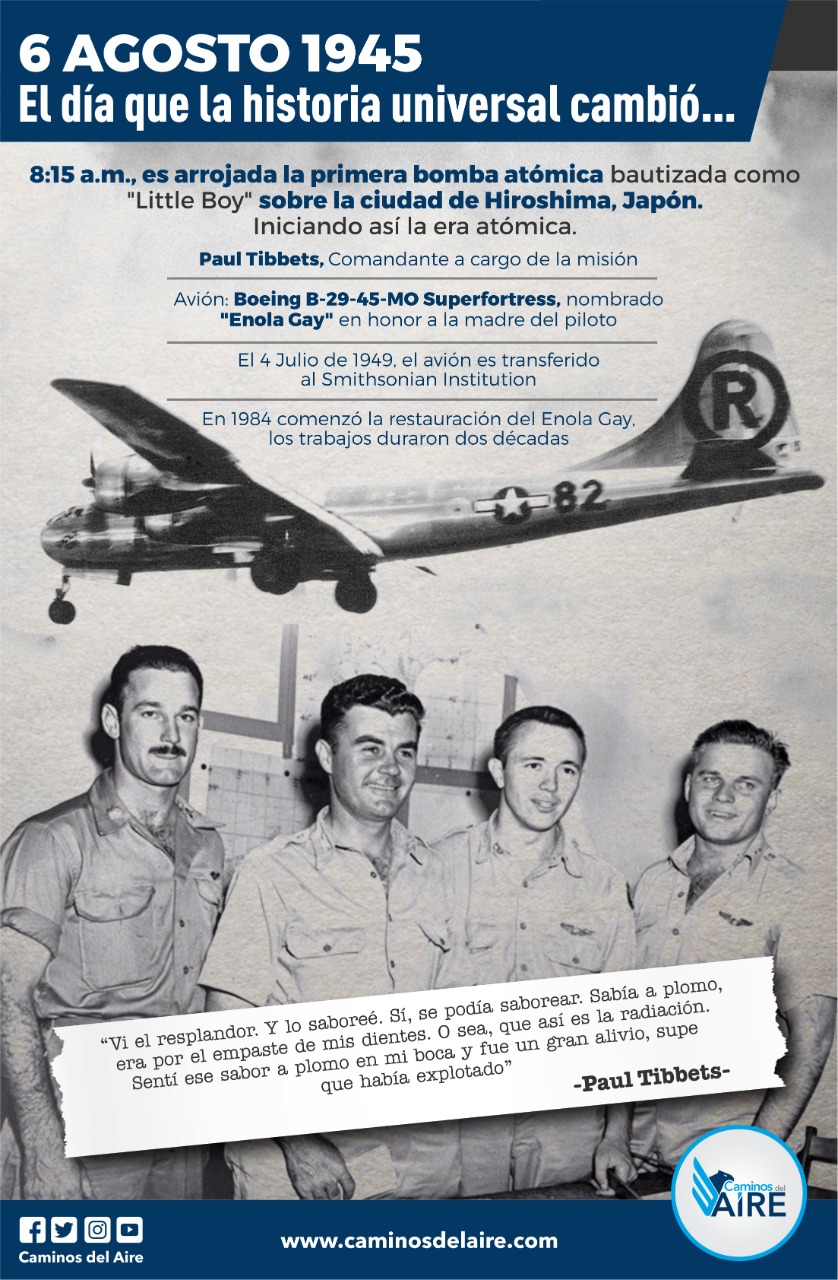 Un día como hoy 6 de Agosto pero de 1945, fue lanzada la primera bomba atómica sobre Hiroshima, Japón, desde un avión Boeing B-29. Actualmente el B-29 “Enola Gay”, es exhibido en el Steven...